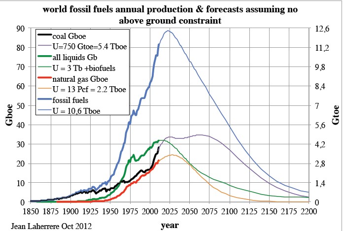 Pour évaluer la disponibilité en énergie fossile, il faut avoir une idée du stock global que l’on pourra exploiter, stock que l’on désigne sous le terme d’Ultime. L’évaluation de cette quantité a été faite soigneusement par Jean Laherrère et d’autres géologues de l’ASPO. C’est une référence en la matière : Jean-Laherrère avait prédit le plafonnement de la production de pétrole dès 1998, dans un célèbre article de Scientific American, alors que l’Agence internationale de l’énergie prédisait des prix du baril ridicules. L’ultime pour le pétrole correspond à 3000 milliards de barils (3 Tb), c’est un ordre de grandeur partagé en France, aussi bien par l’IFP, que par Total. Pour le charbon et le gaz, l’incertitude de l’estimation est plus importante : avec une estimation moyenne du charbon et un peu réservée du gaz, les profils de production seraient les suivants :