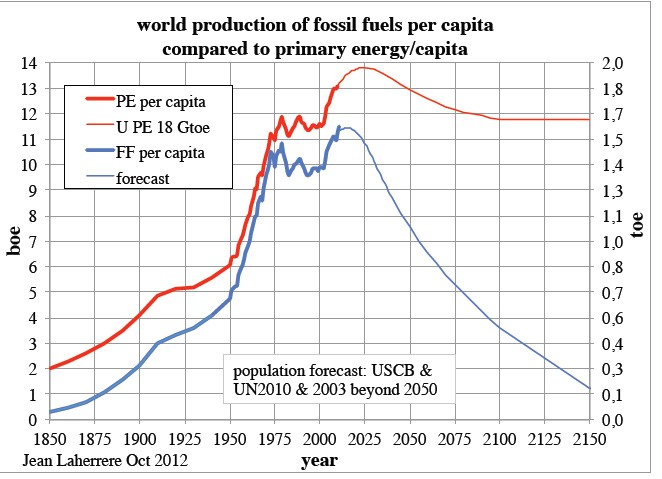 La consommation de pétrole croît par habitant jusqu’aux chocs pétroliers (1973-1986) période à laquelle se développe les programmes nucléaires et des constructions de barrages hydrauliques. La consommation d’énergie fossile chute à nouveau avec la faillite économique du bloc de l’est (1989-1995), et puis c’est reparti comme en 50 ! La croissance de l’Asie fait exploser la consommation de charbon depuis 2000 : La Chine consommait moins de 1.5 Gt de charbon en 2000 et 3 Gt aujourd’hui. L’économie mondiale va se retrouver confronté à une crise des ressources dès la fin de la décennie. L’Europe qui n’a pas d’énergie fossile sera la plus vulnérable.