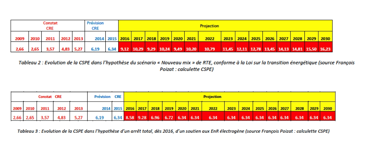 François Poizat a calculé précisément le coût annuel de CSPE qui résultent du rachat imposé de l’éolien et du photovoltaïque (cf porfolio). C’est donc un coût qui s’exerce non seulement sur tous les contribuables, mais aussi sur tous les usagers qui paient leur courant. Ce coût ne prend pas en compte l’augmentation du TURPE, c’est à dire des coûts des réseaux électriques qu’entraine l’utilisation de sources dispersées et fluctuantes