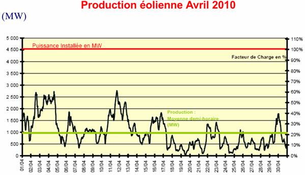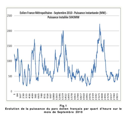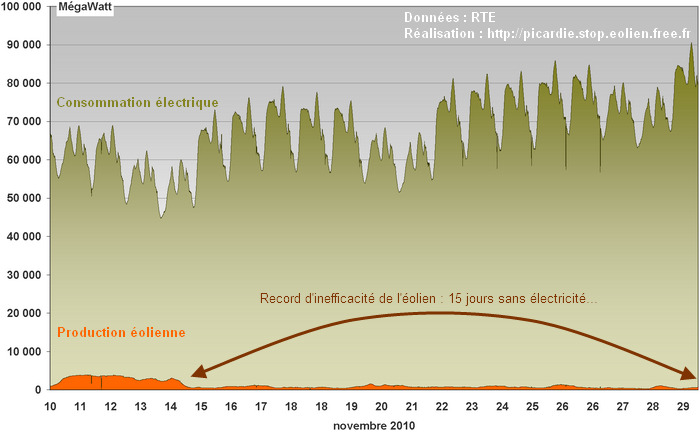 Malgré un foisonnement éolien : il y a des éoliennes un peu partout Méditerranée (400 MW), Manche (1,3 GW), Atlantique (800 MW), Centre (500 MW), Lorraine (500 MW) , etc ... aucune puissance minimale n’est assurée, on peut observer que la production éolienne nationale peut s’arrêter pendant des heures, voir pendant des jours comme le fait remarquer http://picardie.stop.eolien.free.fr/ :