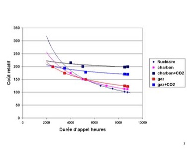 On remarque, que la courbe de coût d’une centrale nucléaire est proche d’une hyperbole, car le revenu dépend de la production annuelle, alors que les centrales fossiles, ont un coût du kWh principalement lié au coût du combustible donc un coût du kWh presque indépendant de la durée d’utilisation.