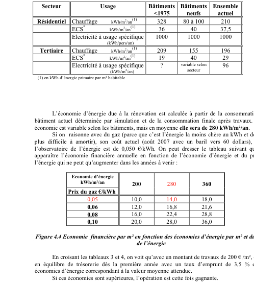 Selon Sidler le parc ancien construit avant 1975, c’est à dire pratiquement sans aucune réglementation thermique consommerait 328 kWh/m2/an en énergie primaire pour le chauffage. En redescendant à 50 kWh/m2/an , on économiserait 280 kWh/m2/an et le coût du kWh économisé reviendrait à 5 c€ pour un investissement de 200 €/m2 :